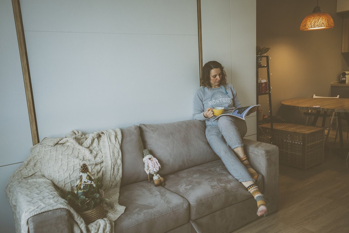 В квартире только одна изолированная спальня, а вторая - это комната-студия, которая должна служить сразу трем функциям - гостиная, кухня-столовая и спальня. На выручку пришла мебель-трансформер. При необходимости, кровать с полноценным матрасом превращается в полноценный диван.