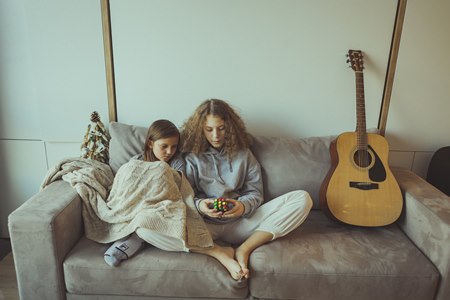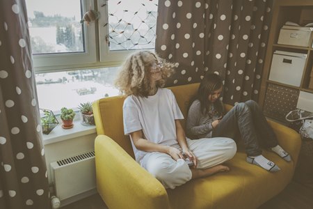 В детской комнате девочки-школьницы, кроме необходимой детской мебели, разместился рабочий стол мамы и дополнительное спальное место - небольшой, уютный, раскладывающийся диванчик.