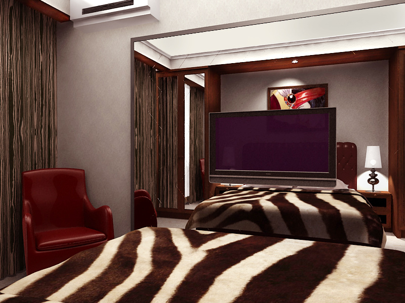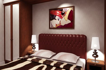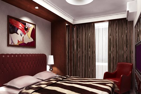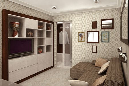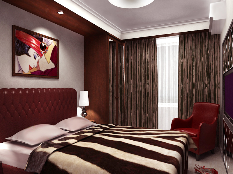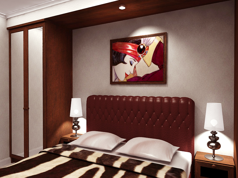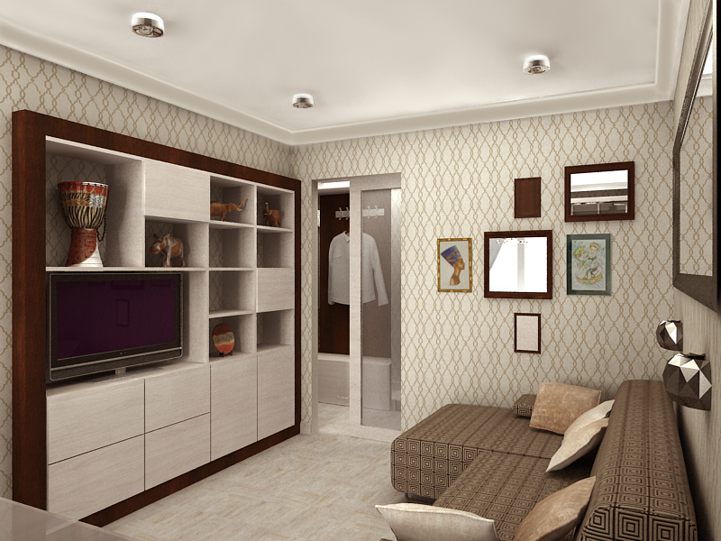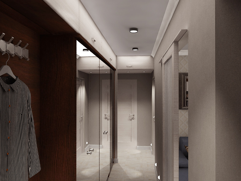 На стадии разработки планировочного решения были предложены различные варианты, но после долгих раздумий и споров, заказчики (замечательная семейная пара с ребенком) все-таки предпочли оставить три небольшие, но изолированные комнаты, а гостиную было решено совместить с кухней. Основным пожеланием заказчиков по стилевому и цветовому решению - было сделать интерьер с элементами стиля Ар-деко, светлыми стенами и контрастной темной мебелью из массива. Запланировано производство встроенных систем хранения (шкафы) под индивидуальный заказ. В квартире решено было установить приточно-вытяжную систему вентиляции, вент-короб которой проходит через две комнаты. В спальне поэтому запроектирован короб из ГКЛ, проходящий над прикроватными шкафами и вдоль оконного проема.