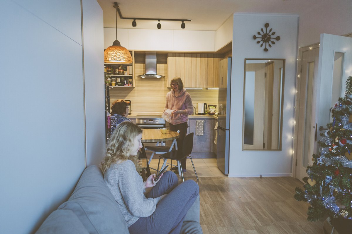 В квартире только одна изолированная спальня, а вторая - это комната-студия, которая должна служить сразу трем функциям - гостиная, кухня-столовая и спальня. На выручку пришла мебель-трансформер. При необходимости, кровать с полноценным матрасом превращается в полноценный диван.